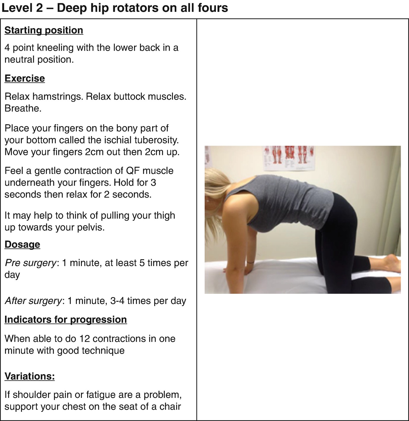 Maintain neutral pelvis with hip abduction, 3 sets 3 times per week goal:
