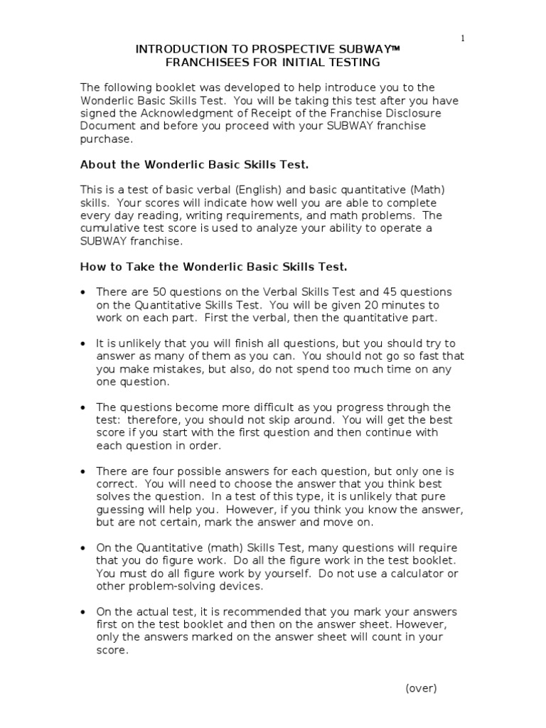 Wonderlic basic skills test sample questions. The test taker has 12 minutes to answer 50. The cumulative test score is used to analyze your ability to operate a subway franchise.